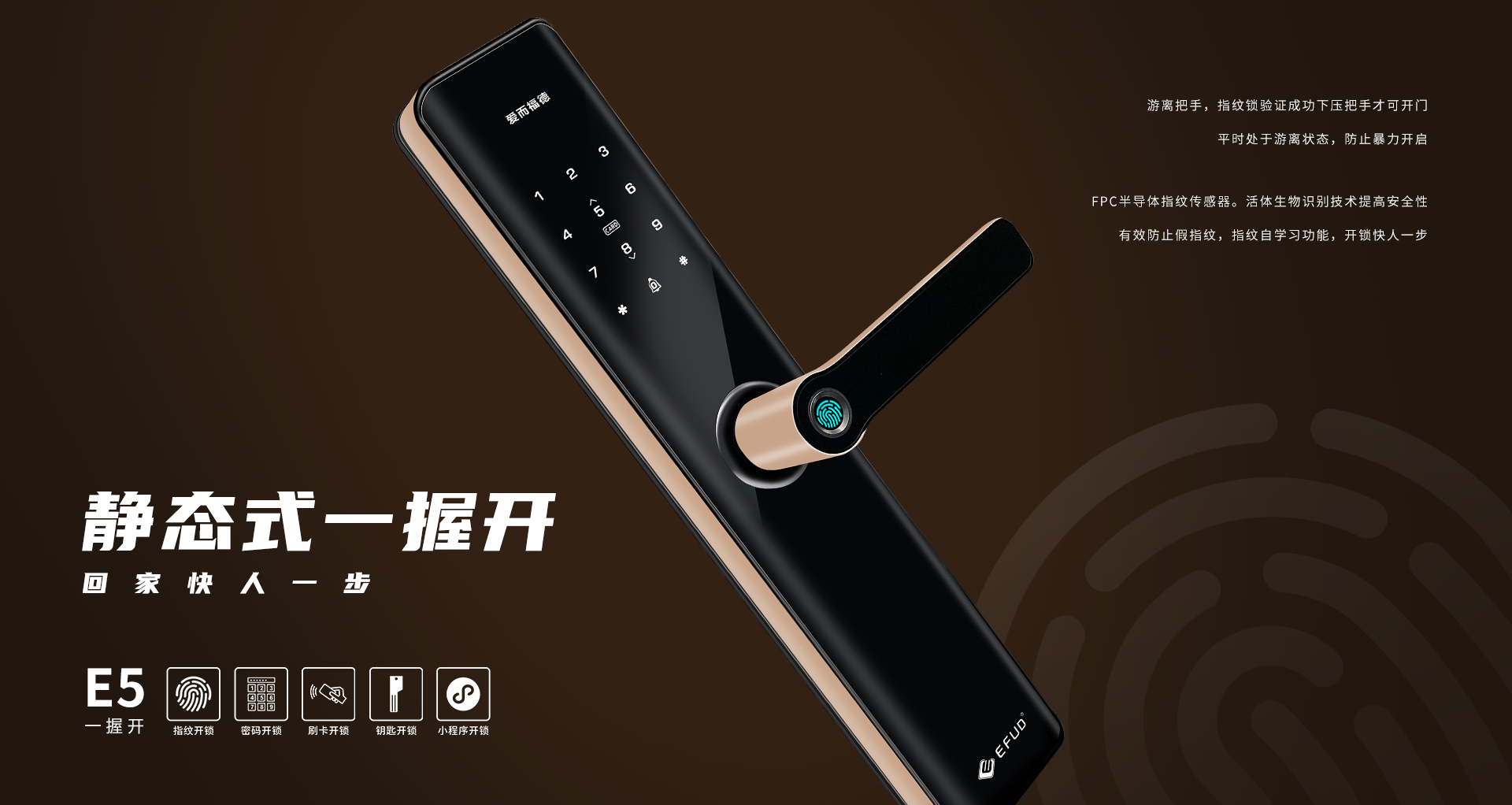 中山市愛(ài)而福德電子科技有限公司專(zhuān)注家用智能鎖25年,是一家集產(chǎn)品研發(fā)、制造、銷(xiāo)售、售后于一體全產(chǎn)業(yè)鏈的國(guó)家高新技術(shù)企業(yè)。公司擁有現(xiàn)代化生產(chǎn)基地8500平方米,具備35000把/月的生產(chǎn)規(guī)模及一支十多年專(zhuān)業(yè)的研發(fā)團(tuán)隊(duì),產(chǎn)品均擁有100%自主知識(shí)產(chǎn)權(quán)。公司一直秉承“創(chuàng)新智造,工匠精神”,為每一位用戶(hù)提供智能、便捷、安全的高品質(zhì)生活!